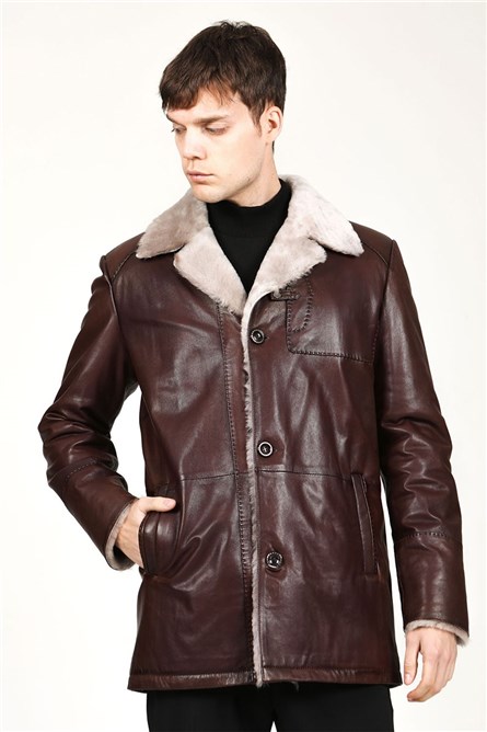 Męski płaszcz z podszewką z prawdziwej skóry SDX-2029 - Ciemny brąz #319244